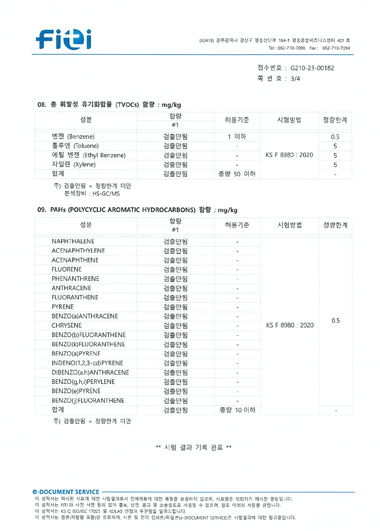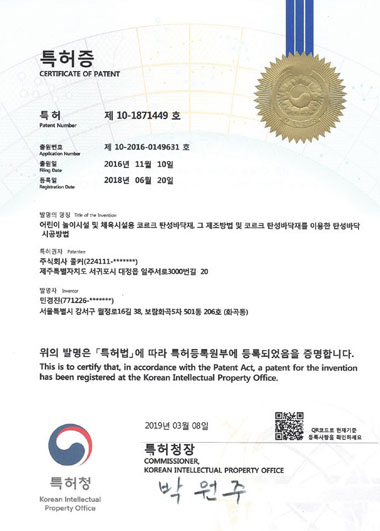 (주)콜커의 컬러 코르크 칩은 국제공인 시험인증원인 FITI의 종합 환경 분석 결과 카드늄, 납, 수은, 크롬 등의 중금속 함량이 허용기준 이하로 알루미늄, 코발트, 비소 등의 용출성 중금속, 프탈레이트 함량, PAHs 함량 또한 허용기준 이하의 테스트 결과가 나온 우수한 친환경소재입니다.